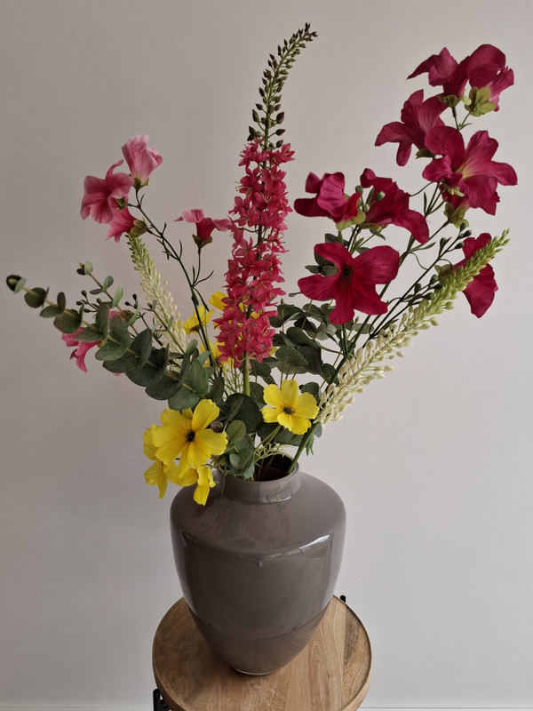 De bloemen stralen in een taupekleurige vaas, die het boeket een moderne en stijlvolle uitstraling geeft.