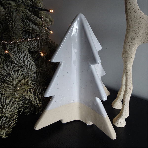 Stijlvol en minimalistisch kerstboom ornament in fris wit met een subtiele beige onderkant. De rustige kleurencombinatie geeft dit decoratiestuk een moderne, natuurlijke uitstraling.