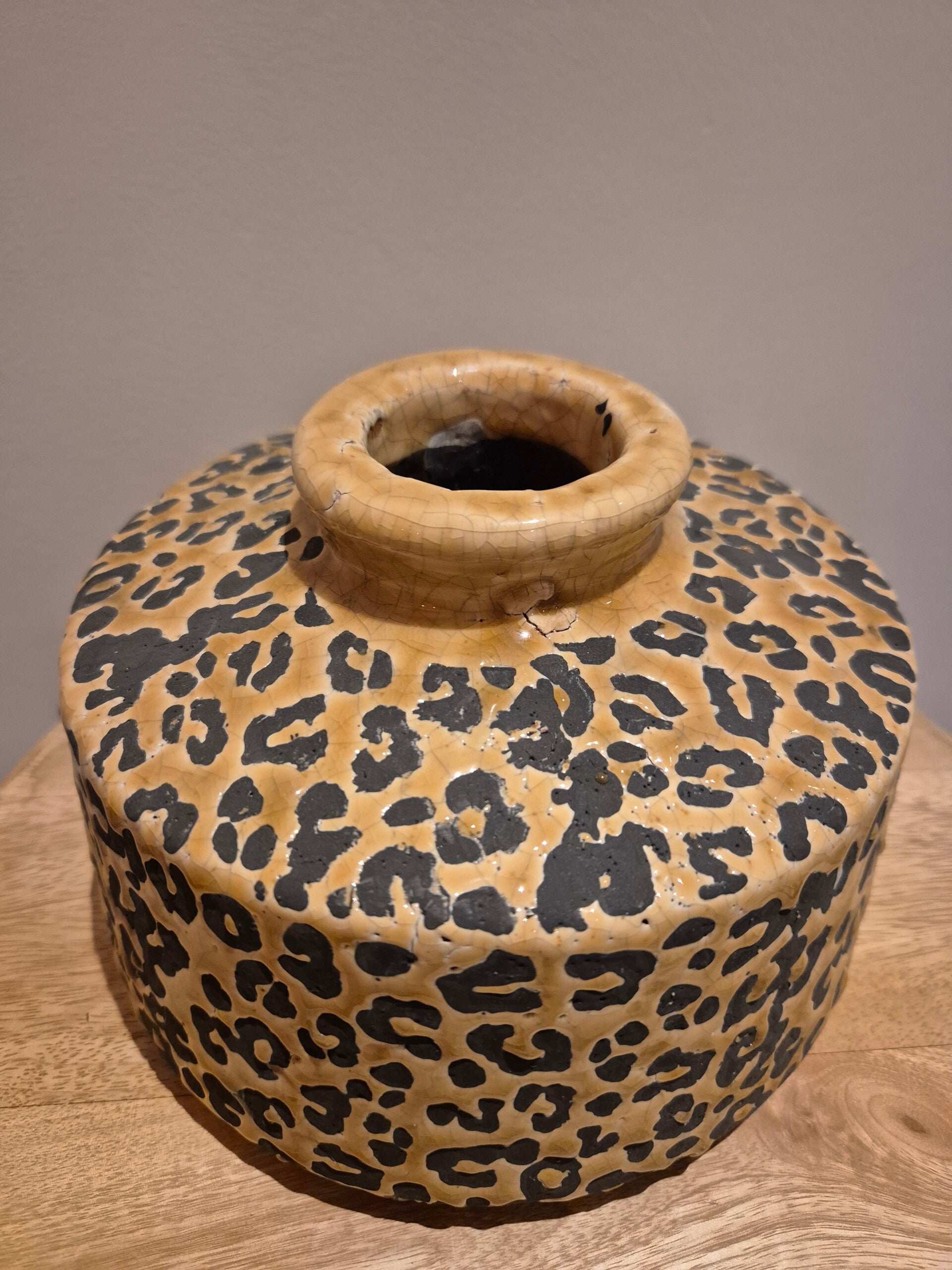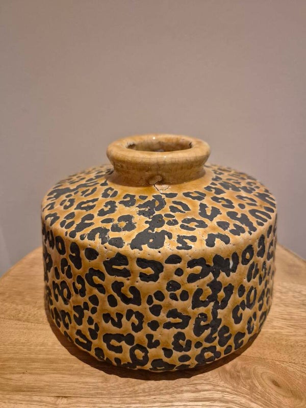 Deze leuke panter pot bewijst dat je met een klein item toch een groot statement kunt maken. De opvallende panterprint in beige en zwart geeft een speelse, stoere touch aan je interieur. Perfect als sierpot voor een hangplantje, droogbloemen of gewoon als decoratief object op een plank, bijzettafel of vensterbank.
